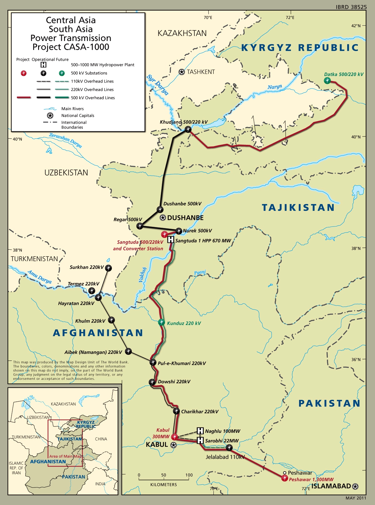 The CASA 1000 Project is expected to develop the necessary physical infrastructure and create the institutional and legal framework to transmit surplus power available from existing generation facilities in Tajikistan and Kyrgyzstan to Afghanistan and Pakistan. The physical infrastructure for CASA 1000 is likely to include: a 500 kV high voltage direct current (HVDC) transmission system between Tajikistan and Pakistan through Afghanistan; an AC transmission link from Kyrgyzstan and Tajikistan to connect to the HVDC line from Tajikistan to South Asia; and the necessary electricity sub-stations in Kabul, Peshawar and Sangtuda (in Tajikistan).
