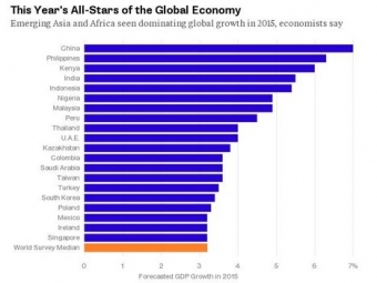 Агентство Bloomberg опросило экспертов-экономистов по поводу того, какие страны будут лидерами по экономическому росту в 2015 году. Верхние строчки рейтинга занимают государства Азии и Африки.