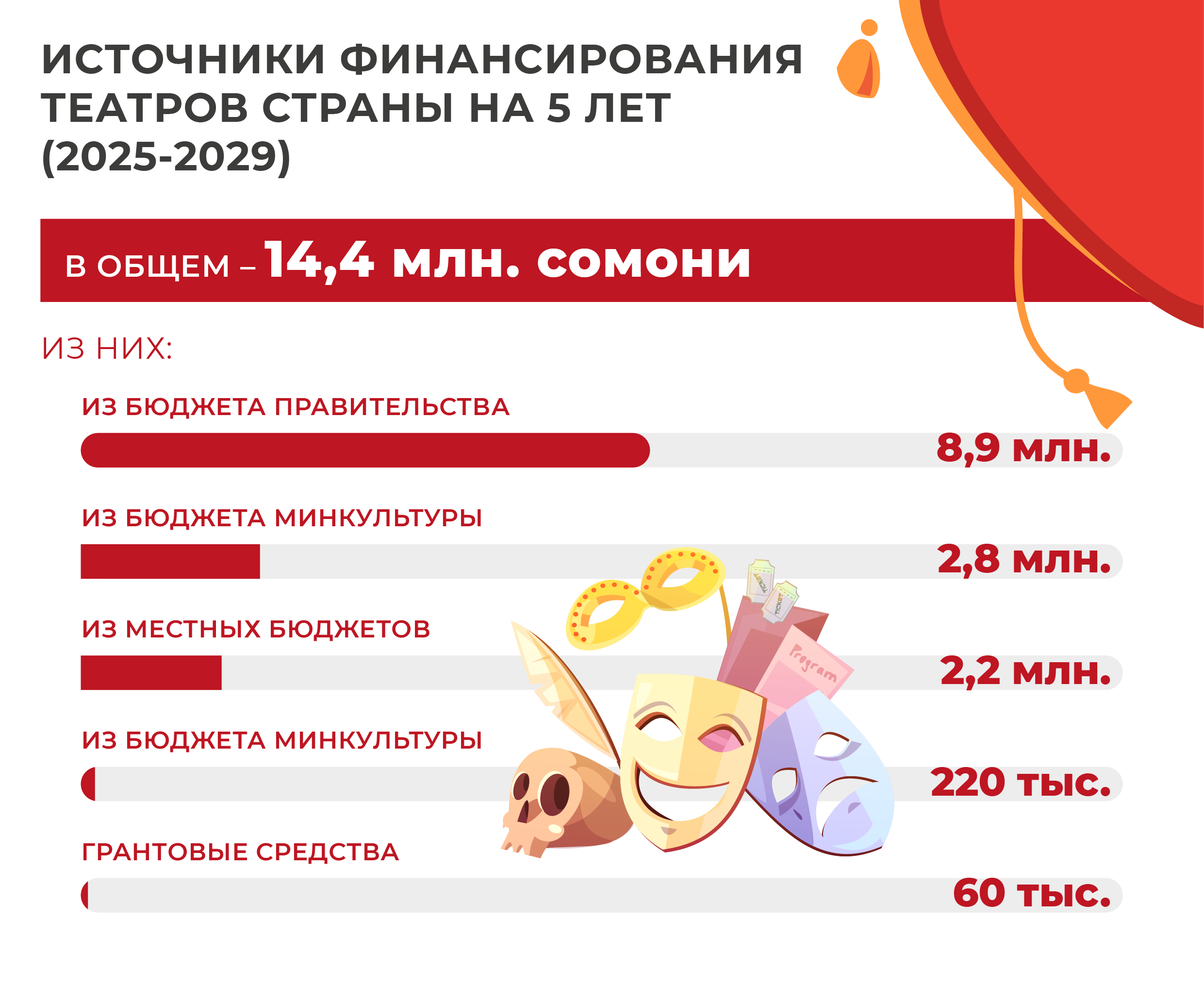 Общий бюджет программы составляет 14 млн 313 тыс. сомони. Средства поступают из республиканского бюджета, бюджета Минкультуры, местных бюджетов, собственных доходов театров и грантов.
