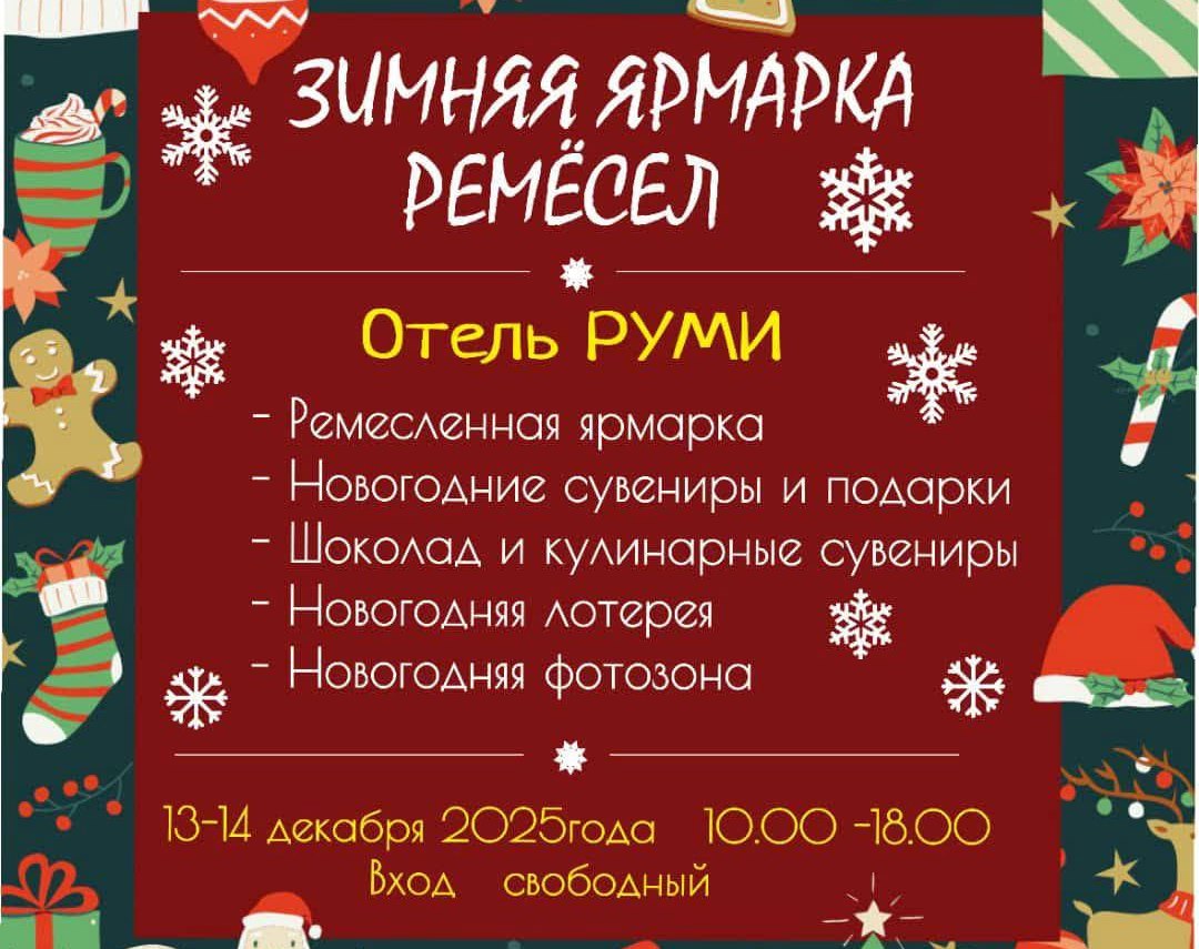 - В отеле «Руми» с 10:00 до 17:00 пройдёт традиционная зимняя ярмарка ремёсел, где вы найдете идеальные подарки для родных и близких – от брелоков до оригинальной бижутерии и ювелирных изделий, а также пряники, шоколад и прочие сладости, выполненные в рождественской стилистике. Это ярмарка, где собрано всё самое яркое и уникальное, а главное – в одной локации. В дни ярмарки будет проводиться праздничная лотерея, и у каждого покупателя есть шанс стать обладателем приза. Вход свободный.