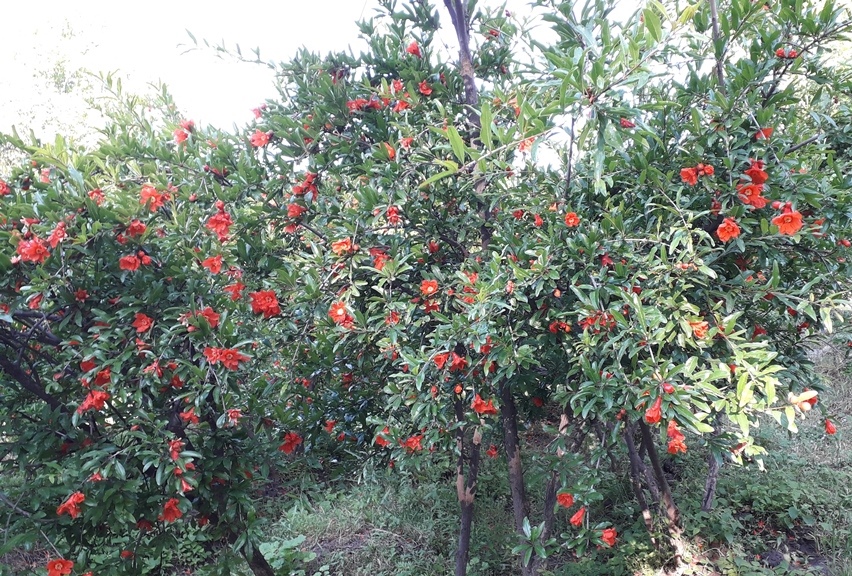 Гранат, чаще кустарник или небольшое дерево с колючками высотой до 5 м. Цветение длится долго - с мая по август. В период цветения на ветках остаются женские цветы для завязки плодов, а мужские падают на землю и создают ландшафт, напоминающий красный ковер. Поэтому их сажают возле домов не только из-за плодов, но и как декоративное растение.