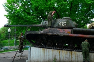Уже около недели военнослужащие 201-й Российской военной базы ремонтируют танк ИС-2, установленный на Площади Победы в Душанбе.