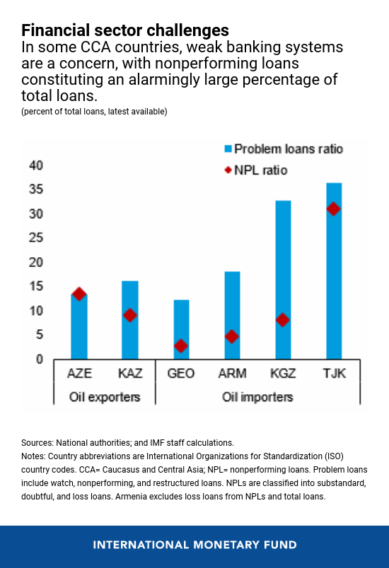 3. Persistent challenges remain—and banking weaknesses are near the top of the list. Countries in the Caucuses and Central Asia face legacy challenges from reforms that have long been left unresolved. For example, banking systems are burdened with problematic assets such as nonperforming loans (NPLs) and restructured loans. In some countries, the percentage of loans that have become troublesome has reached alarming levels. Tajikistan’s problem loans, for example, constitute more than 35 percent of its total loans, according to the latest data, with a significant majority of those being NPLs. As a result, pockets of bank stress persist, eroding lending capacity and inhibiting credit growth.