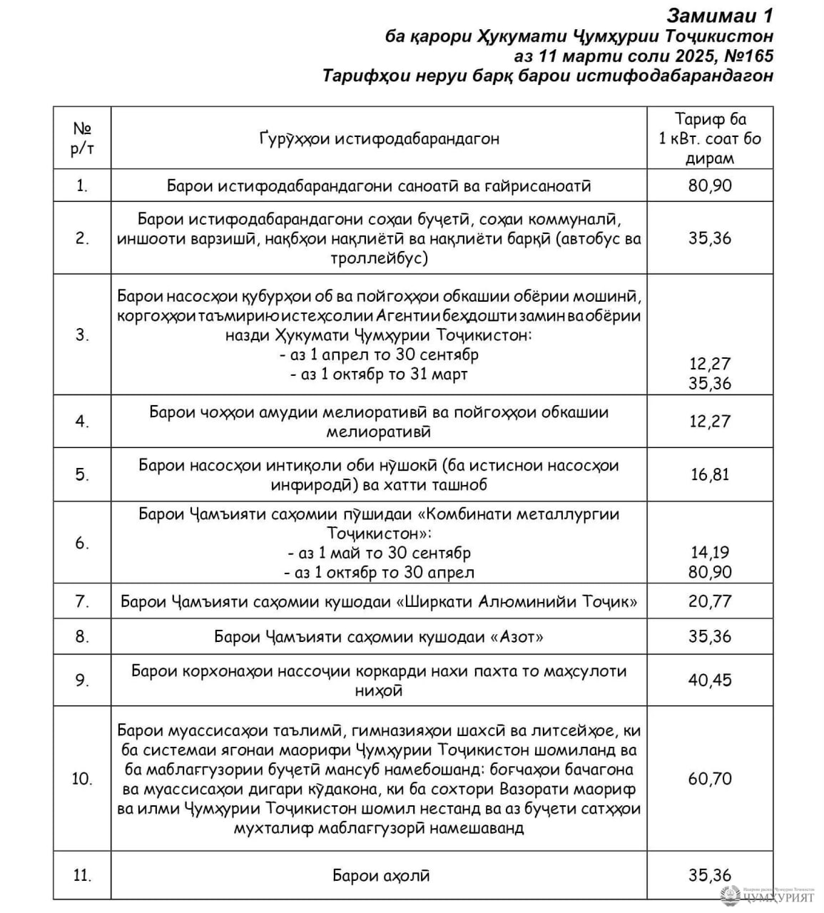 - барои пойгоҳҳои интиқоли оби нӯшокӣ (водопровод) ва пойгоҳҳои обкашии обёрии мошинӣ, пойгоҳҳои таъмиру истеҳсолии Агентии мелиоратсия ва обёрии назди ҳукумати ҶТ аз 1-уми апрел то 30-юми сентябр – 12,27 дирам (қаблан - 9,2 дирам) ва аз 1-уми октябр то 31-уми март – 35,36 дирам (қаблан - 26,51 дирам);