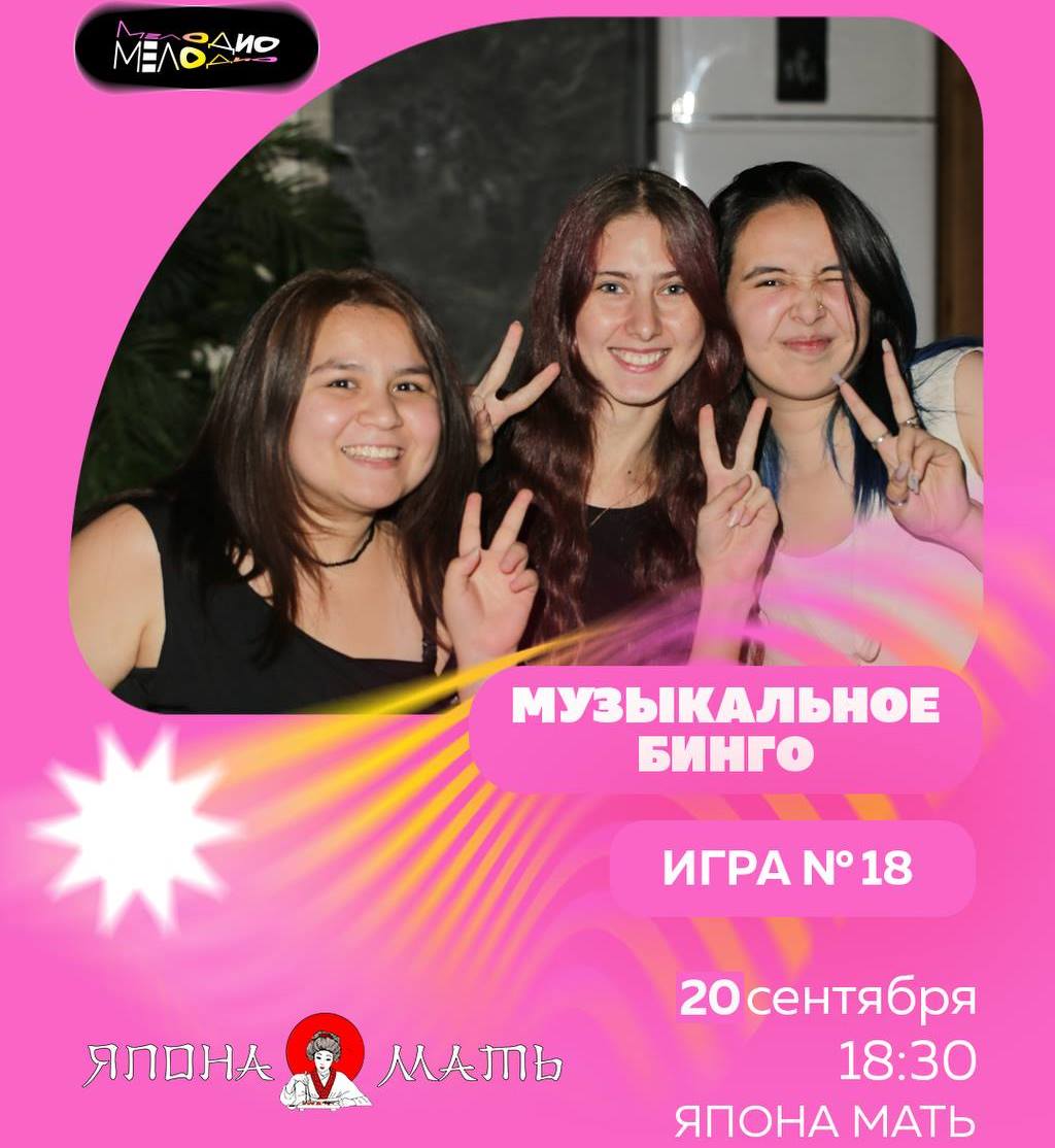 В ресторане «Япона мать» 20 сентября в 18:30 пройдет очередная музыкальная игра «Мелодио» с элементами квиза. Вас ждут популярные треки, зажигательное караоке и классные призы от партнеров программы.