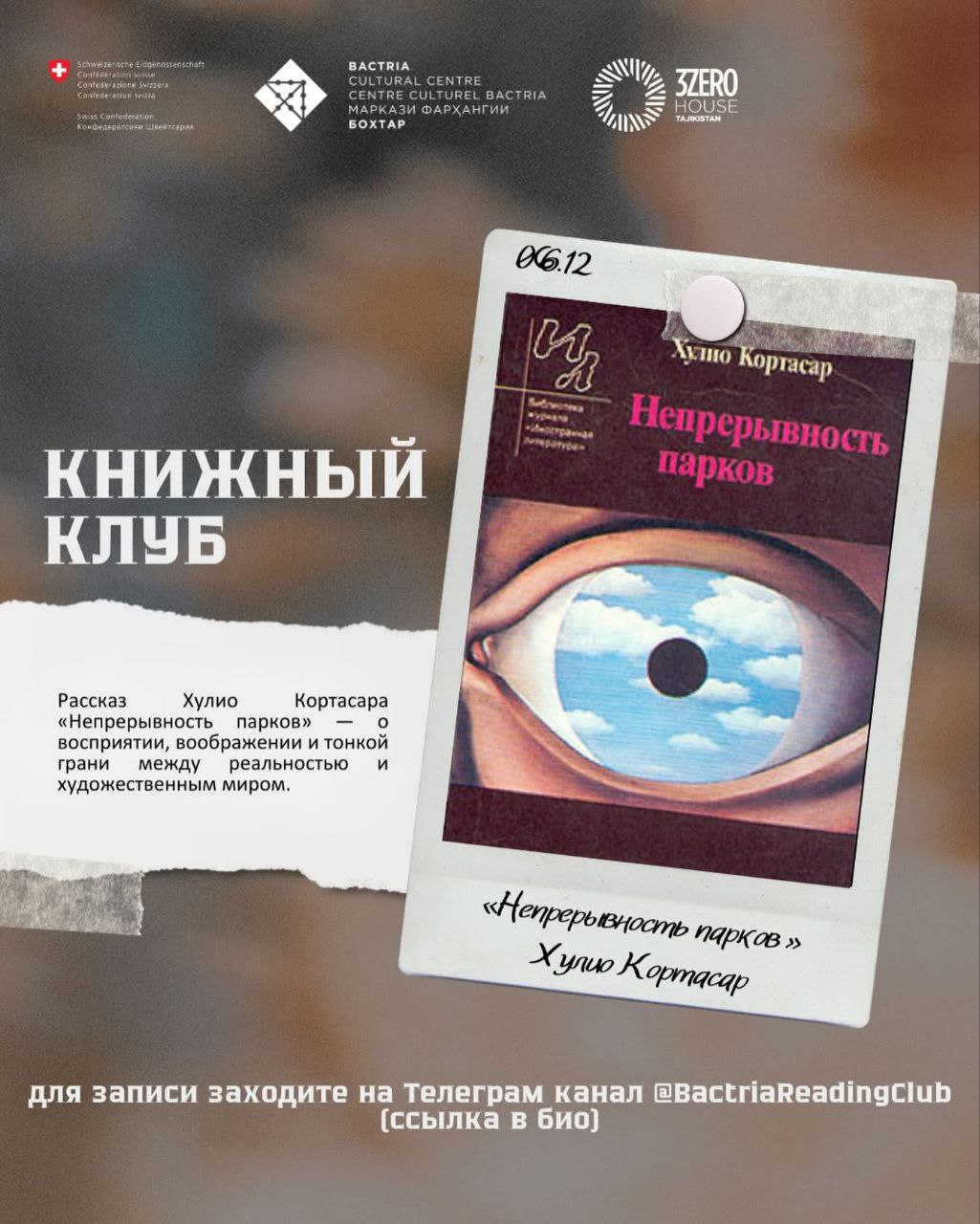 В Культурном центре «Бактрия» 6 декабря в 17:00 пройдёт очередная встреча Читательского клуба. На этот раз объектом обсуждения станет рассказ Хулио Кортасара — «Непрерывность парков» (Continuidad de los parques). Рассказ нужно прочитать заранее. Время чтения 5-10 минут. Рассказ можно скачать здесь.