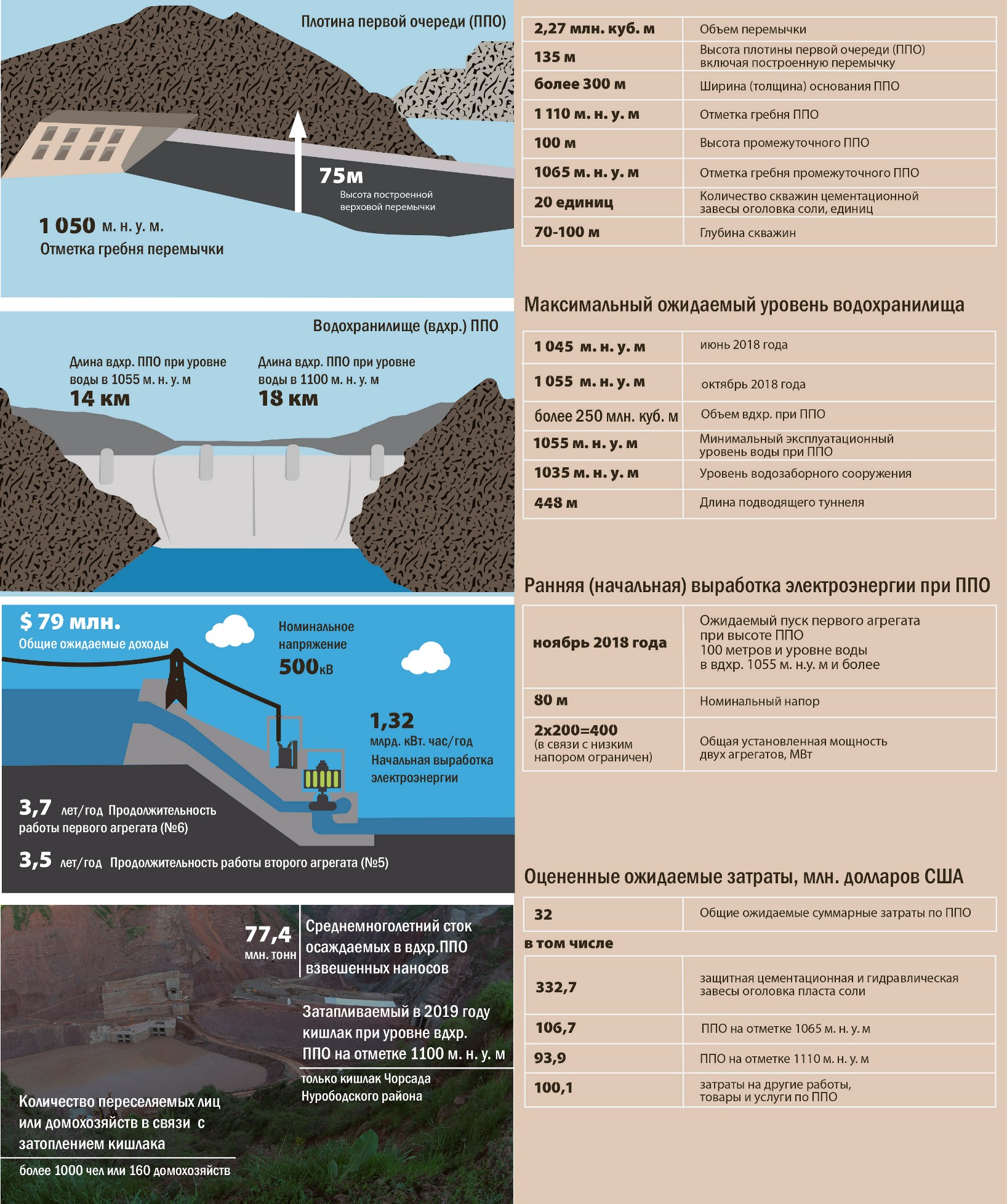 Первым делом был построен город Рогун, многоэтажные дома, школа на 1200 мест, детский сад «Юнга». Началось пробивание строительных туннелей, план предусматривал пробивку 63 километров туннелей.