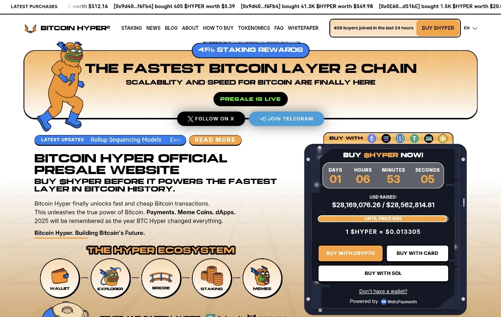 На пресейле у Bitcoin Hyper уже видно, что спрос высокий. Привлечено более $28 млн. Цена токена закрепилась на уровне $0,013305, и его можно сразу отправлять в стейкинг.