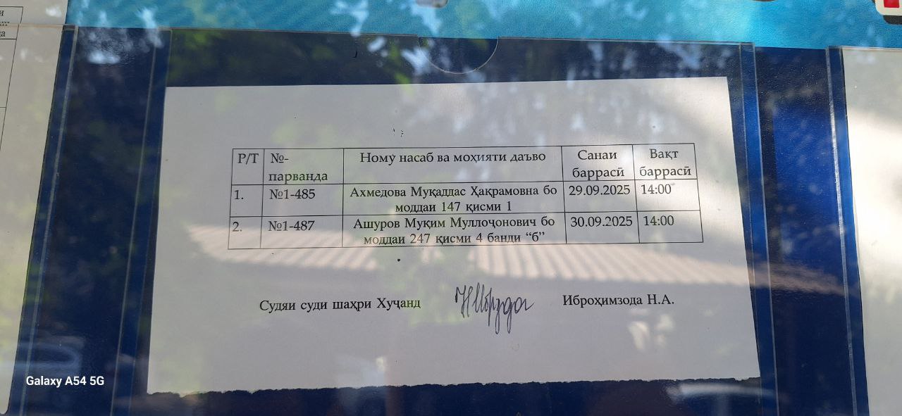 Имя Мукима Муллоджоновича Ашурова значится в официальном расписании судебных заседаний Худжандского городского суда. Слушание дела должно было состояться 30 сентября в 14:00 под председательством судьи Иброхимзода Н.А.