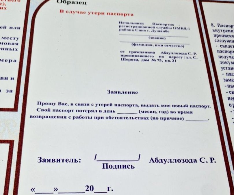 Если за пределами Таджикистана – необходимо сообщить об этом в органы внутренних дел страны пребывания, а также в дипломатическое представительство или консульское учреждение Республики Таджикистан.