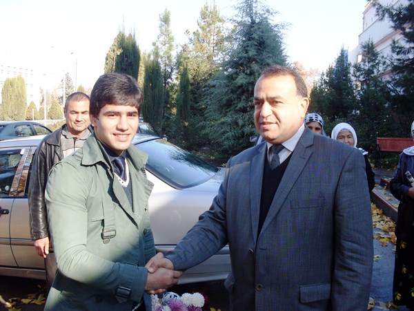 Мэр Куляба Абдугаффор Рахмонов наградил сегодня, 8 декабря, чемпиона мира по каратэ-до Мамаджона Наимова и чемпиона Азии по греко-римской борьбе Фаридуна Тиллоева.