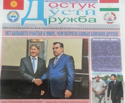 Накануне нового года вышел первый номер совместной кыргызско-таджикской газеты «Дружба». Газета выпускается при финансовой поддержке Центра ОБСЕ в Бишкеке на трех языках: русском, таджикском и кыргызском. Ее тираж пять тысяч экземпляров, а периодичность выхода - один раз в месяц.