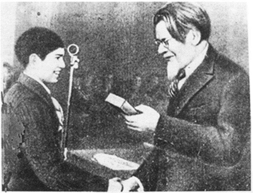 Председатель Президиума Верховного Совета СССР М. Калинин вручает участнику памирского детского этнографического ансамбля Абдулвахобу Мирзошоеву медаль «За трудовое отличие», 1941 год (Мирзошоев – отец известного таджикского певца Муборакшо).Среди других хоровых песен - «Песня о Памире», «Гуль-Лола», «Мамлакат», «Из Памира в Москву». В ансамбле - много солистов. Все они одновременно и танцоры, и певцы, и музыканты».
