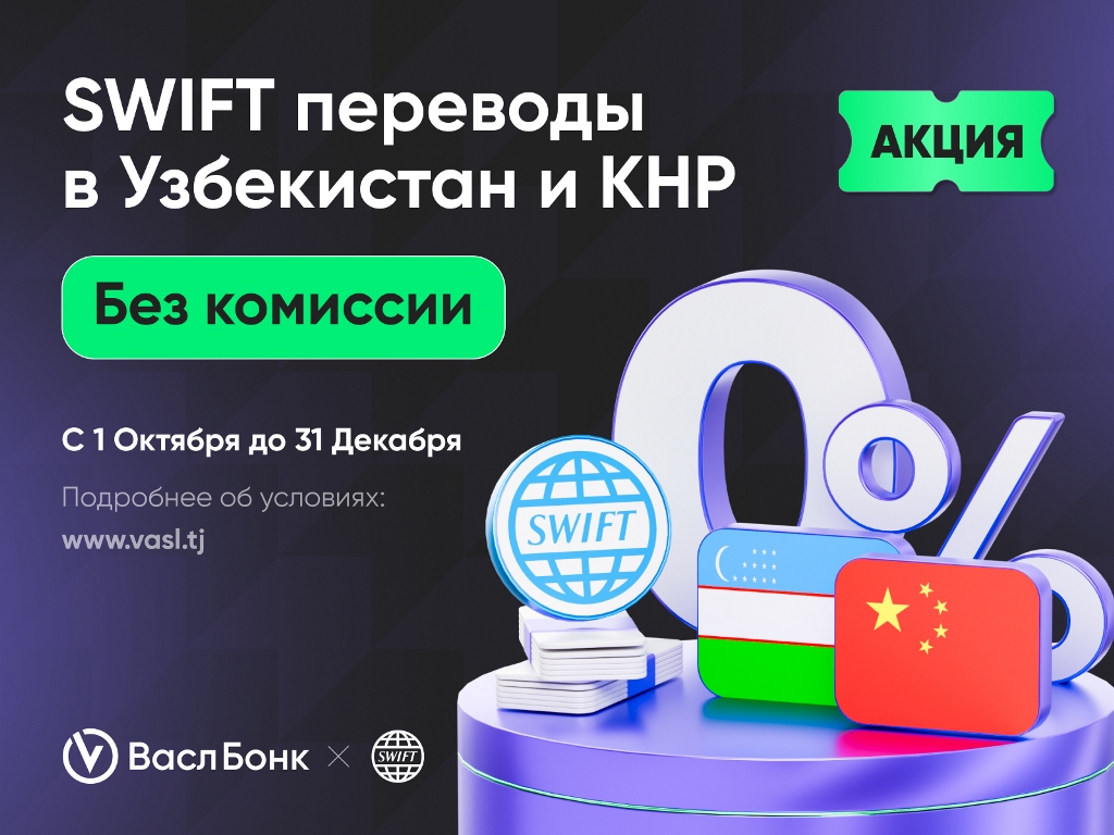 С 1 октября по 31 декабря 2025 года «Васл Банк» объявляет выгодную акцию: международные переводы в Узбекистан и КНР через систему SWIFT с комиссией 0%.