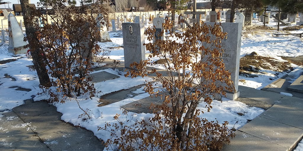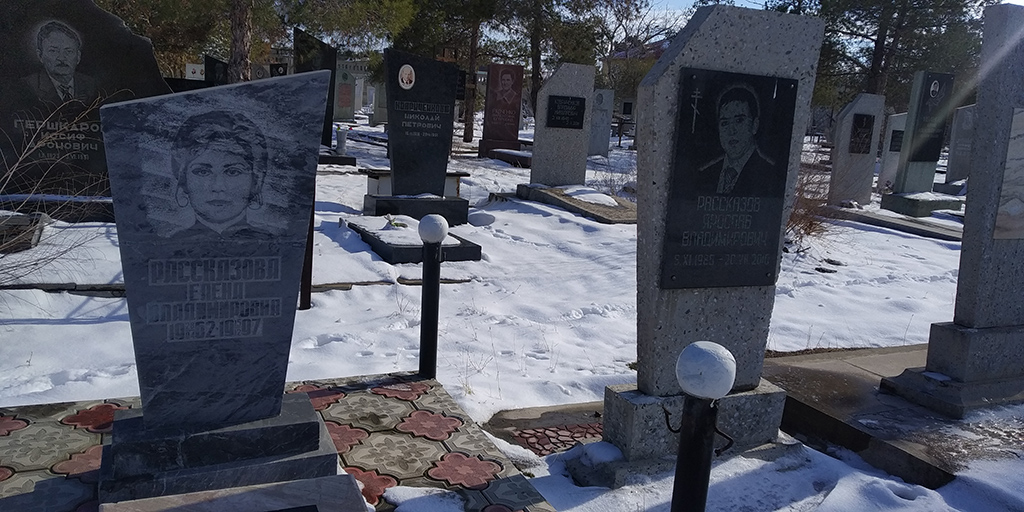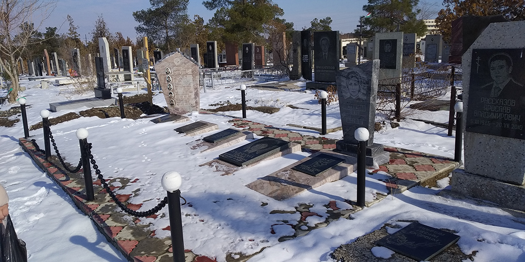 Мы останавливаемся у запорошенных снегом надгробных плит с выгравированными именами пяти членов экипажа рейса Худжанд-Шарджа, погибших 15 декабря 1997 года.