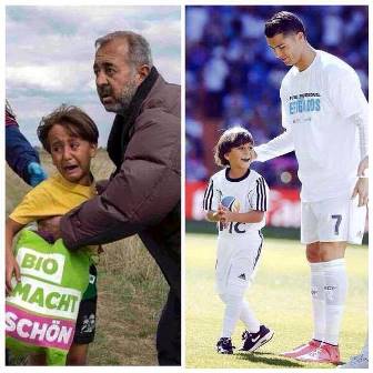 Нападающий «Реала» Криштиану Роналду в субботу, 19 сентября, вышел на матч против «Гранады» с мальчиком из Сирии, отцу которого на венгерской границе поставили подножку.