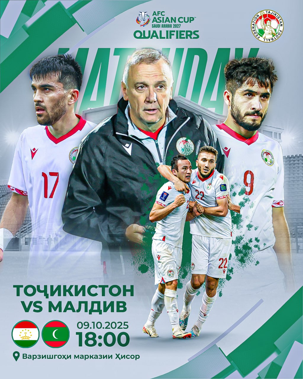 - Имрӯз, соати 18:00 дар Варзишгоҳи марказии шаҳри Ҳисор дастаи мунтахаби футболи Тоҷикистон дар бозии даври сеюми марҳилаи интихобии Ҷоми Осиё-2027 бо тими миллии Малдив рақобат мекунад.