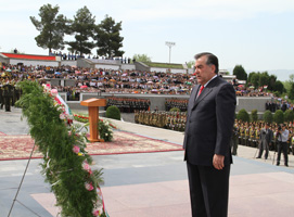 Аз ороишҳои асосии тантанаи идонаи бахшида ба солгарди 67 Ғалаба дар Ҷанги Бузурги Ватании солҳои 1941-1945 расми гузашти низомии ҷузъутомҳои гарнизони Душанбе аз назди Президенти Ҷумҳурии Тоҷикистон, Сарфармондеҳи олии Қувваҳои Мусаллаҳ Эмомалӣ Раҳмон буд.