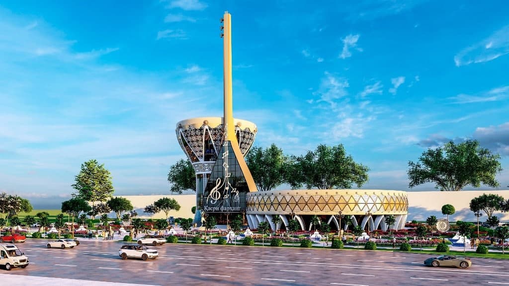 Тибқи лоиҳаи ангоравӣ, аз берун иншоот дар шакли асбобҳои миллии мусиқии тоҷикӣ: дутор, дойра, таблак оро дода шудааст.
